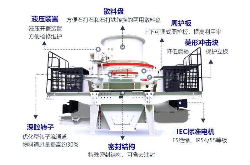 3、沖擊式制砂機采用的是石打石、石打鐵的制砂原理,不僅生產效率高而且粒型更好,同時也避免了傳統錘頭打砂飛粉的問題。