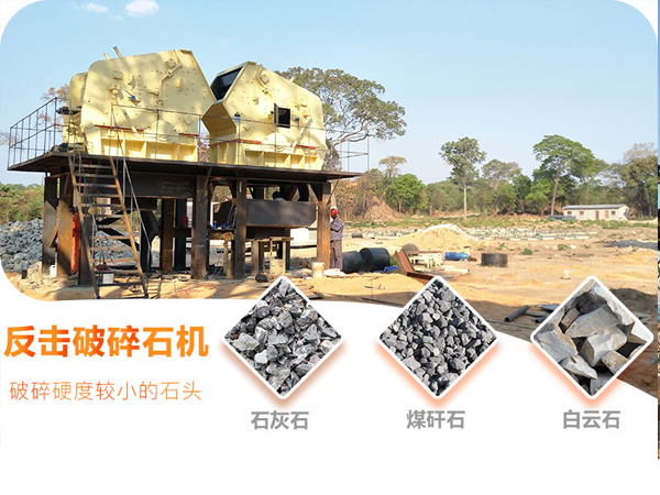 4.反擊式破碎機 同樣作為中級破碎設備,主要用于處理硬度中等或較低的物料,常用的有石灰石,煤矸石,石英石等,時產量同樣可以達到800噸,出料粒型好也被稱作物料整形機,相比來說反擊式破碎機相比圓錐式破碎機價格更優惠。